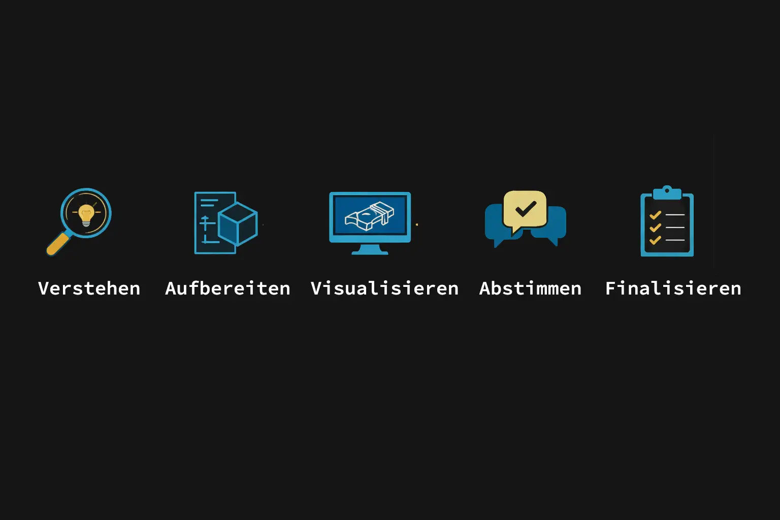 Unsere Arbeitsweise ist darauf ausgelegt, komplexe Inhalte sicher, effizient und zielgerichtet zu visualisieren – mit klaren Abstimmungen und planbaren Ergebnissen.